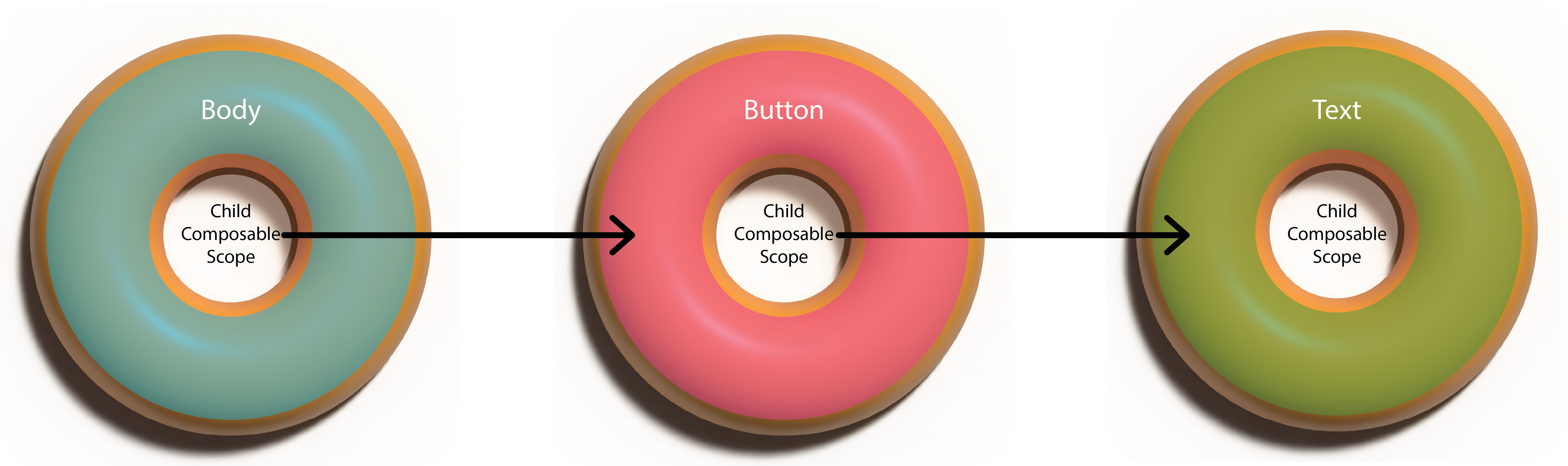 Composable을 도넛이라고 생각하면 됩니다. 구멍은 하위 Composable이라 생각하면되는데(여기서 Text는 구멍이 없는 게 정상이지만 편의상 모두 도넛으로 표현하겠습니다), 이는 Recomposition이 skip 될 수도 있다는 것을 의미합니다. 결국, 도넛 구멍안에 도넛이 있고 그 도넛 구멍안에 또 도넛이 있는 형태로 볼 수 있습니다.